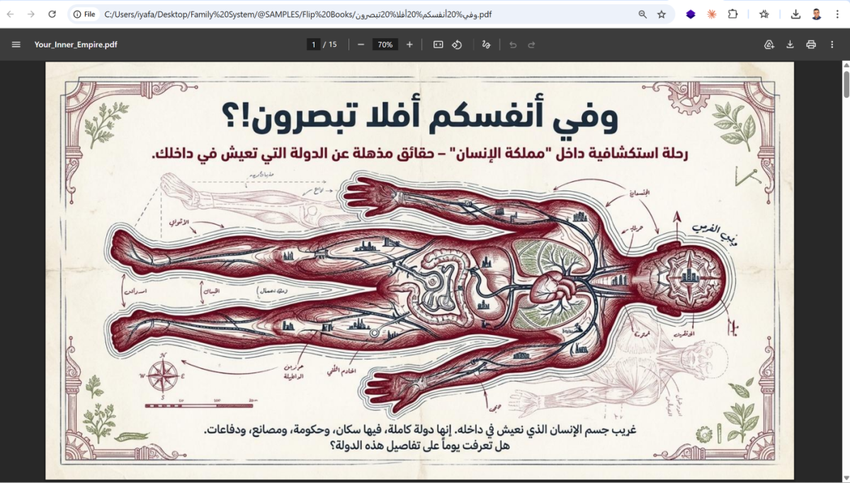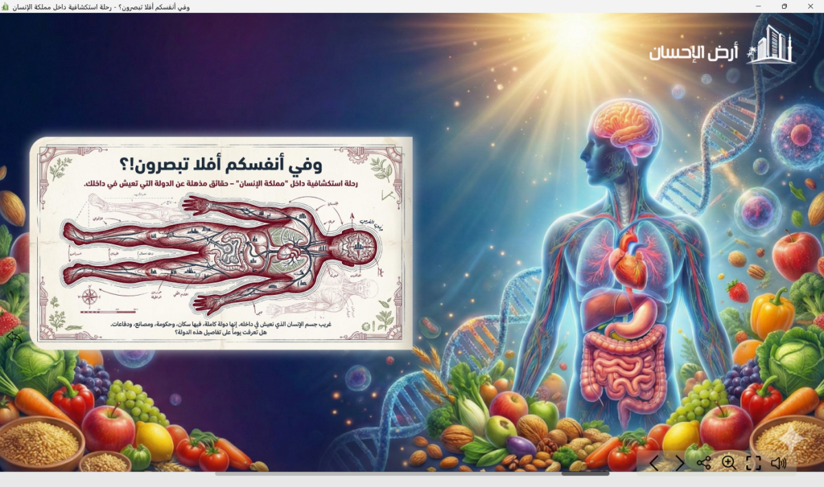يستعرض هذا المنتج رؤية شاملة وعميقة حول عظمة الخالق في تكوين الجسم البشري، حيث يشبه أعضاءه الحيوية بمؤسسات دولة متكاملة تدير شؤونها بدقة متناهية. يستعرض الفيديو الحقائق العلمية المذهلة المتعلقة بعدد الخلايا وتجددها، مع تسليط الضوء على الوظائف الحيوية للمخ والقلب وجهاز المناعة كأنظمة أمنية وإدارية معقدة. كما يشتمل الفيديو على دليل غذائي مفصل يوضح كيفية الاستغناء عن المكملات الصناعية من خلال الأطعمة الطبيعية الغنية بالفيتامينات والمعادن الضرورية. ينتهي الفيديو بتصنيف المجموعات الغذائية الأساسية، مؤكداً على أهمية التأمل في الذات البشرية والتعرف على إبداع الخالق لهذا الكيان الجسدي. يهدف الفيديو في مجمله إلى تعزيز الوعي الصحي والتقدير الفطري للميكانيكا الحيوية التي تضمن استمرار حياة الإنسان.