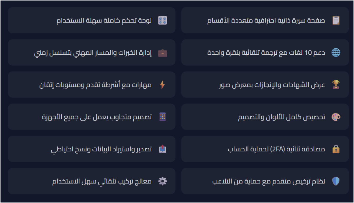 نظام متكامل لإنشاء وإدارة سيرتك الذاتية على الإنترنت بتصميم عصري واحترافي. يتضمن لوحة تحكم كاملة لإدارة جميع بياناتك الشخصية، خبراتك المهنية، شهاداتك، ومهاراتك التقنية. يدعم النظام 10 لغات مع ترجمة تلقائية، نظام ترخيص متقدم، مصادقة ثنائية، ووضع صيانة. مبني بتقنيات PHP و MySQL مع تصميم متجاوب يعمل على جميع الأجهزة.