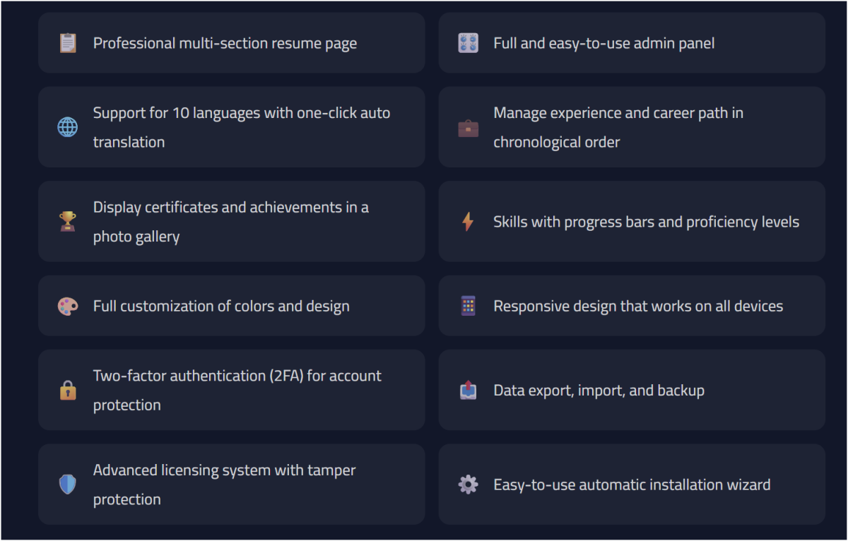 A lifetime activation code for the professional resume system. After purchase, the Purchase Code and Encrypt Key are generated instantly and automatically. Enter the credentials in the system control panel to permanently activate it on your domain. The license is valid for a single domain with no expiration date.