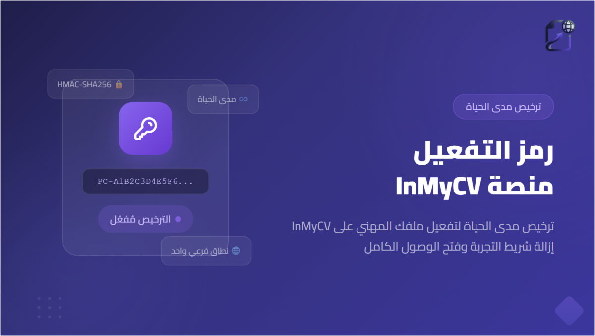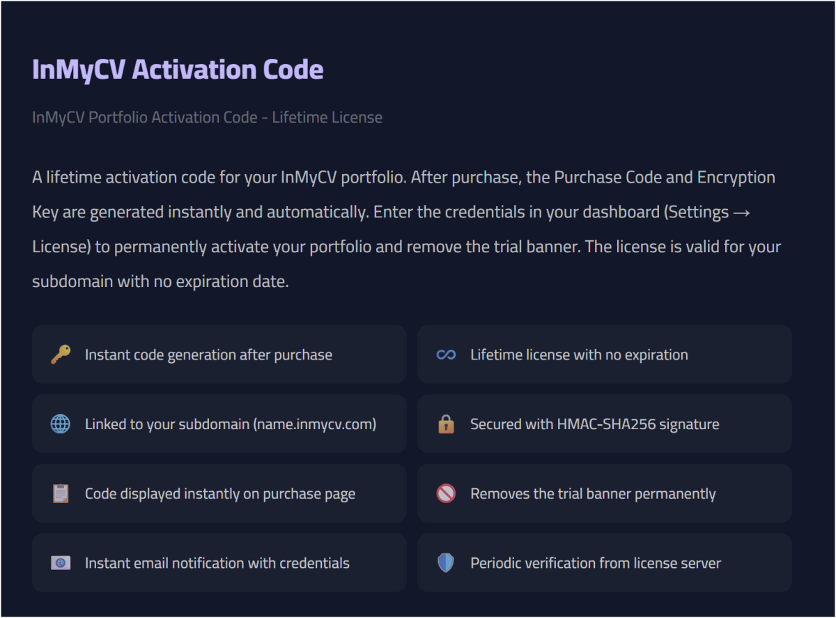 A lifetime activation code for your InMyCV portfolio. After purchase, the Purchase Code and Encryption Key are generated instantly and automatically. Enter the credentials in your dashboard (Settings → License) to permanently activate your portfolio and remove the trial banner. The license is valid for your subdomain with no expiration date.