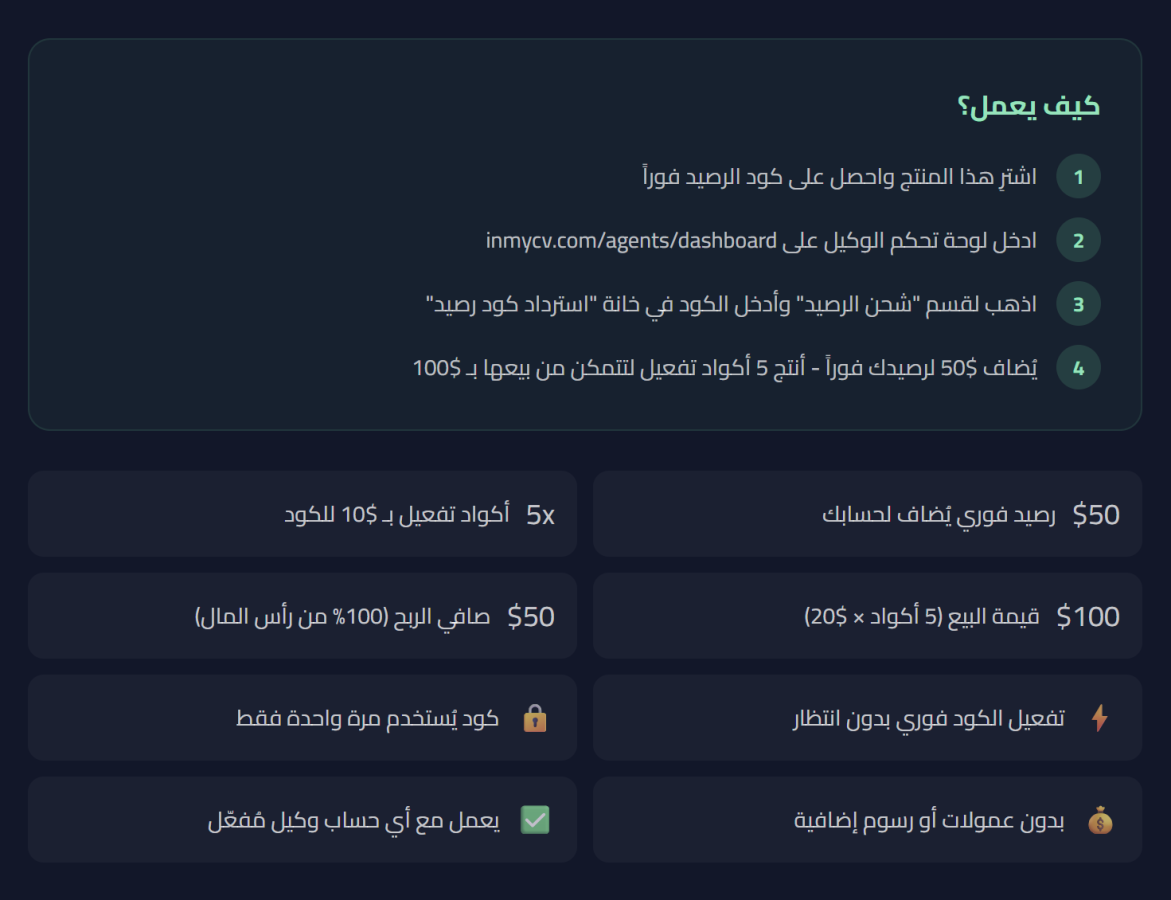 كود شحن رصيد بقيمة 50 دولار لحسابك كوكيل معتمد في منصة InMyCV. بعد الشراء، يتم إنشاء كود الرصيد فوراً وتلقائياً. أدخل الكود في لوحة تحكم الوكيل (شحن الرصيد) ليُضاف المبلغ لحسابك مباشرة. استخدم رصيدك لإنتاج أكواد تفعيل بسعر 10$ للكود لتتمكن من بيعها لعملائك بالسعر الرسمي 20$ محققاً ربح 100% من رأس المال.